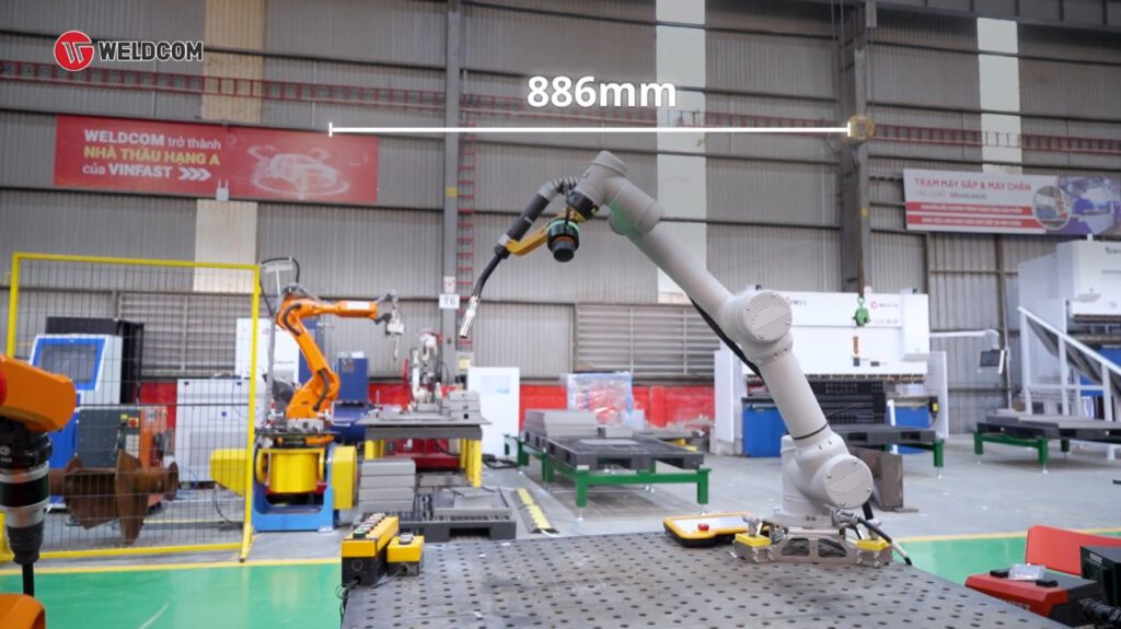 - Bán kính làm việc: từ 850 – 1350 mm, đáp ứng đa dạng nhu cầu hàn khung, chi tiết nhỏ và cụm kết cấu.