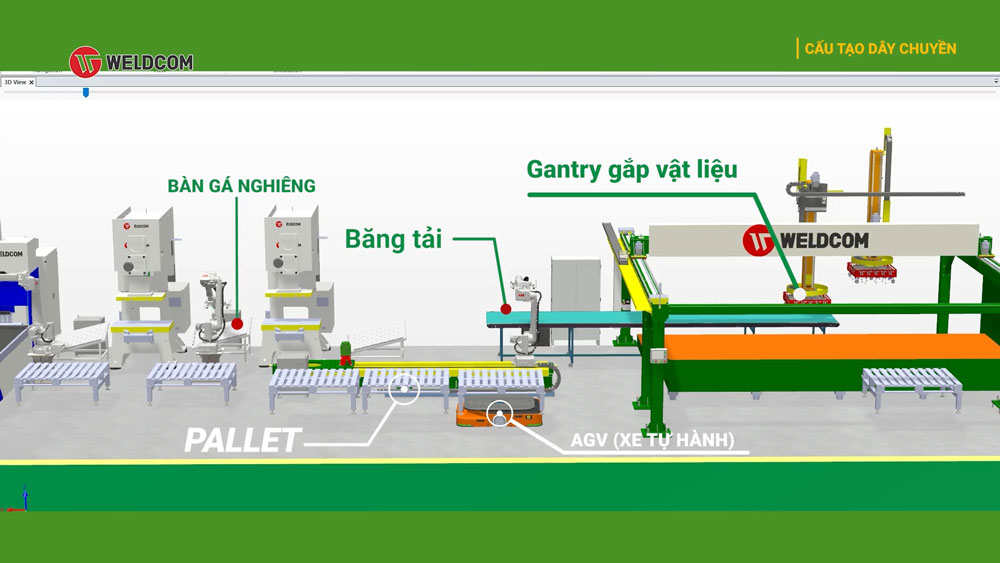 - Hệ thống xử lý và vận chuyển vật liệu: Gantry gắp vật liệu, băng tải, AGV (Xe tự hành), bàn gá nghiêng và các pallet lưu trữ sản phẩm.