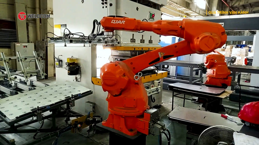 - Tại công đoạn dập, robot chạy trên day sẽ gắp sản phẩm từ băng truyền, đưa lên bàn gá nghiêng để định vị góc, sau đó đặt vào máy dập để gia công. Nếu sản phẩm cần nhiều bước dập, robot sẽ luân chuyển phôi giữa các máy dập trước khi chuyển sang công đoạn tiếp theo.