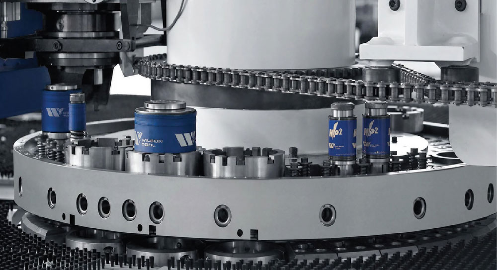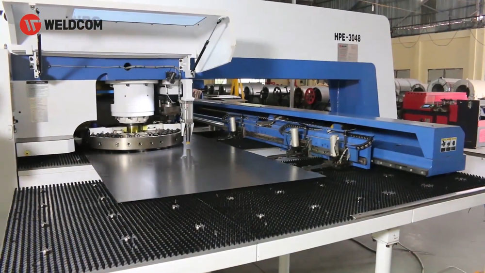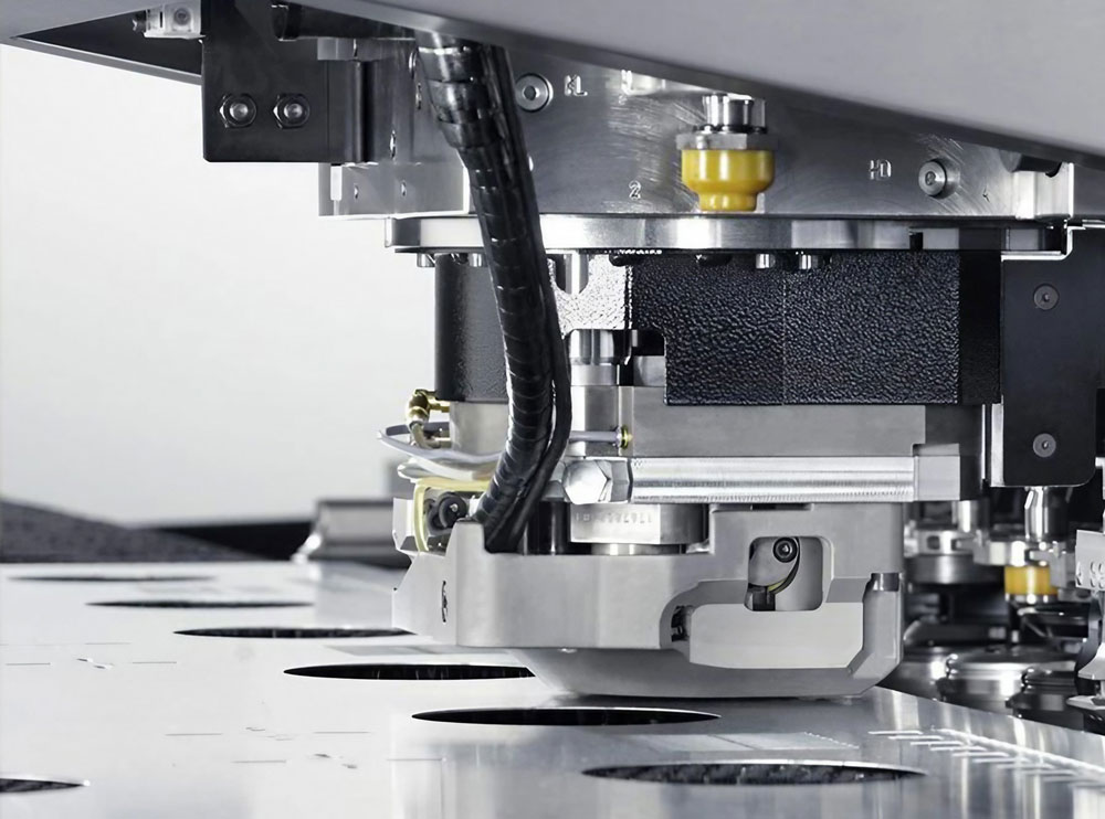 Linh hoạt về hình dạng gia công: Hệ thống turret cho phép thay nhanh chày – cối nhiều kích thước, giúp máy có thể đột lỗ tròn, vuông, oval, khe dài, ký tự hoặc hoa văn trang trí chỉ trong một lần gá đặt.
