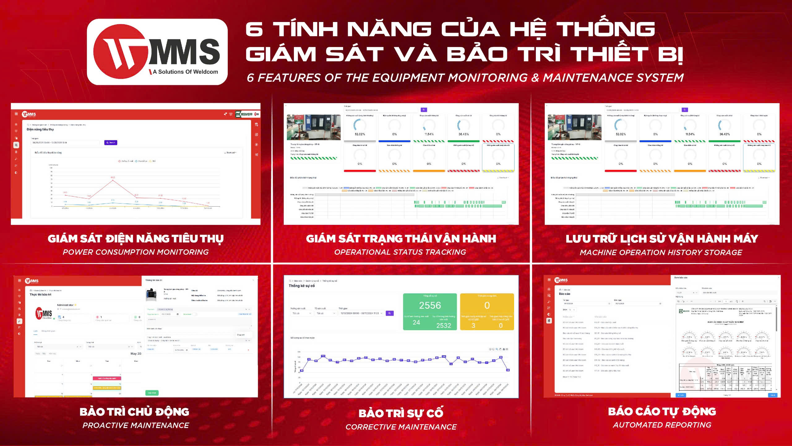 WMMS (Weldcom Monitoring Machine and Maintenance Management System) is an advanced software system that provides comprehensive support in managing equipment performance and maintenance for manufacturing enterprises. The system powerfully integrates modern technologies such as AI and IoT to monitor, analyze, and optimize the entire maintenance process-from planning and execution to performance monitoring.