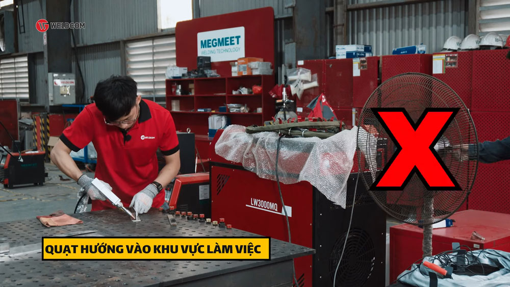 - Không sử dụng quạt thổi trực tiếp vào vùng hàn. Luồng gió mạnh có thể làm nhiễu khí bảo vệ, gây ra các lỗi như rỗ khí, cháy chân hoặc mối hàn không đồng đều, ảnh hưởng đến chất lượng sản phẩm.