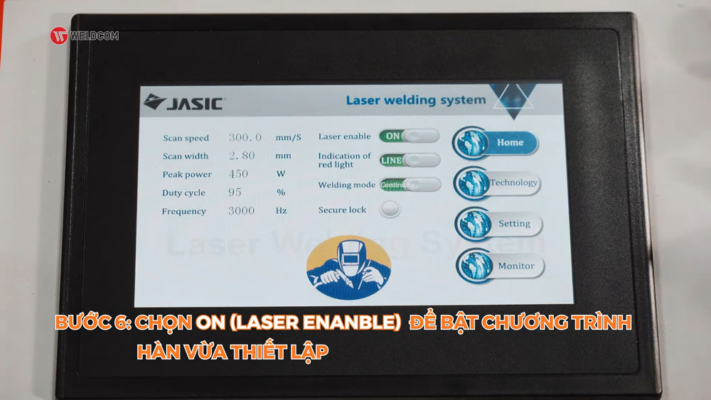 6. Nhấn “ON” (Laser enable) để kích hoạt chương trình hàn đã thiết lập