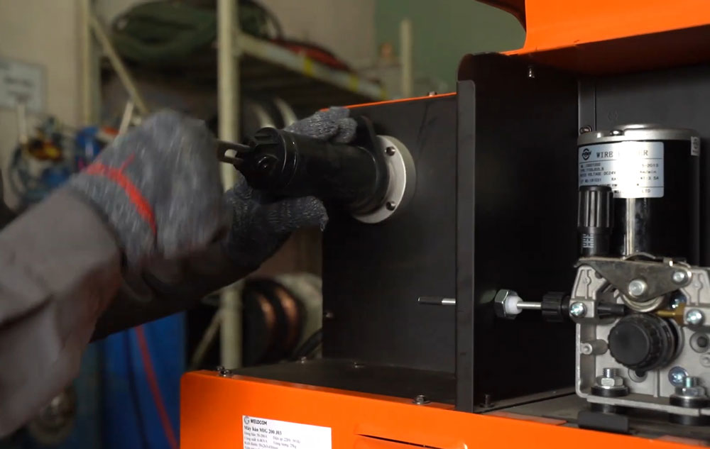 Tiến hành lắp súng hàn MIG vào máy, đảm bảo đúng vị trí tiếp xúc của ống dẫn dây, van khí và công tắc, vặn chặt các khớp nối để tránh rò rỉ khí.