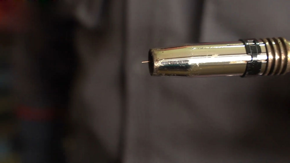 Sau đó, bấm nút tua dây cho đến khi dây hàn nhô ra khỏi miệng súng. Lắp lại bép hàn và vỏ súng hàn.