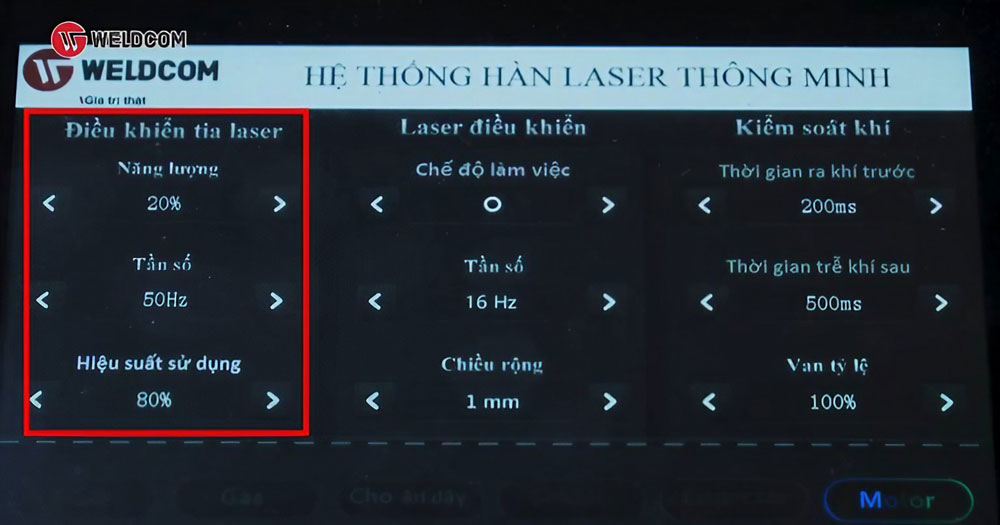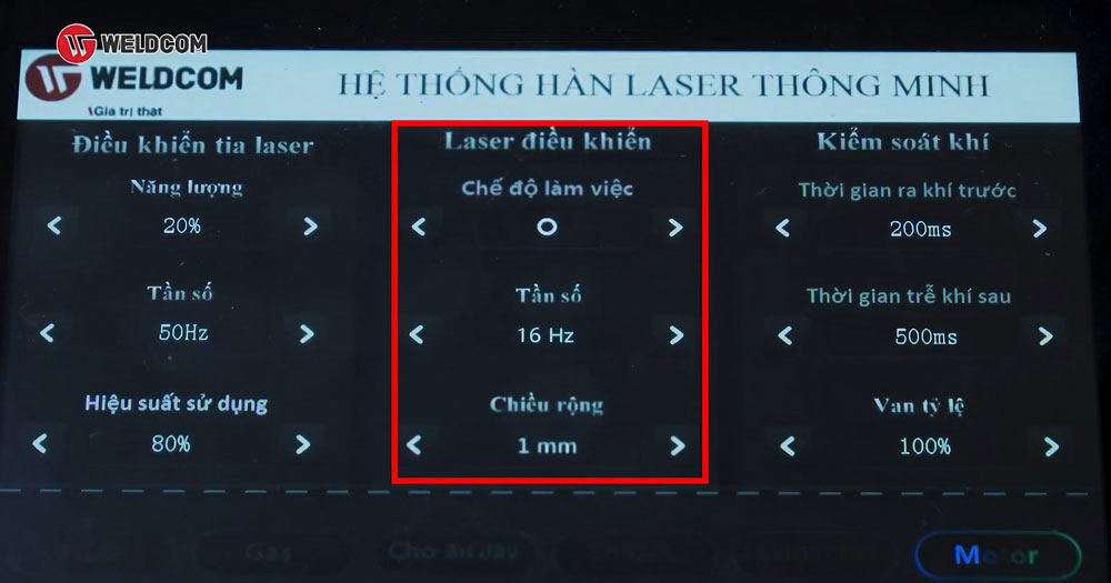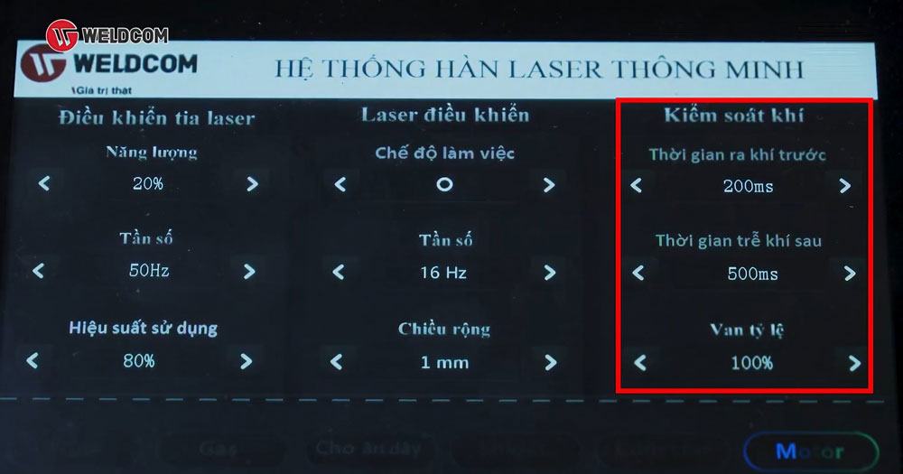 Đây là khu vực cài đặt thời gian cấp khí trước và thời gian trễ khí sau khi hàn. Hai thông số này đóng vai trò rất quan trọng trong quá trình vận hành máy hàn laser Weldcom, giúp: