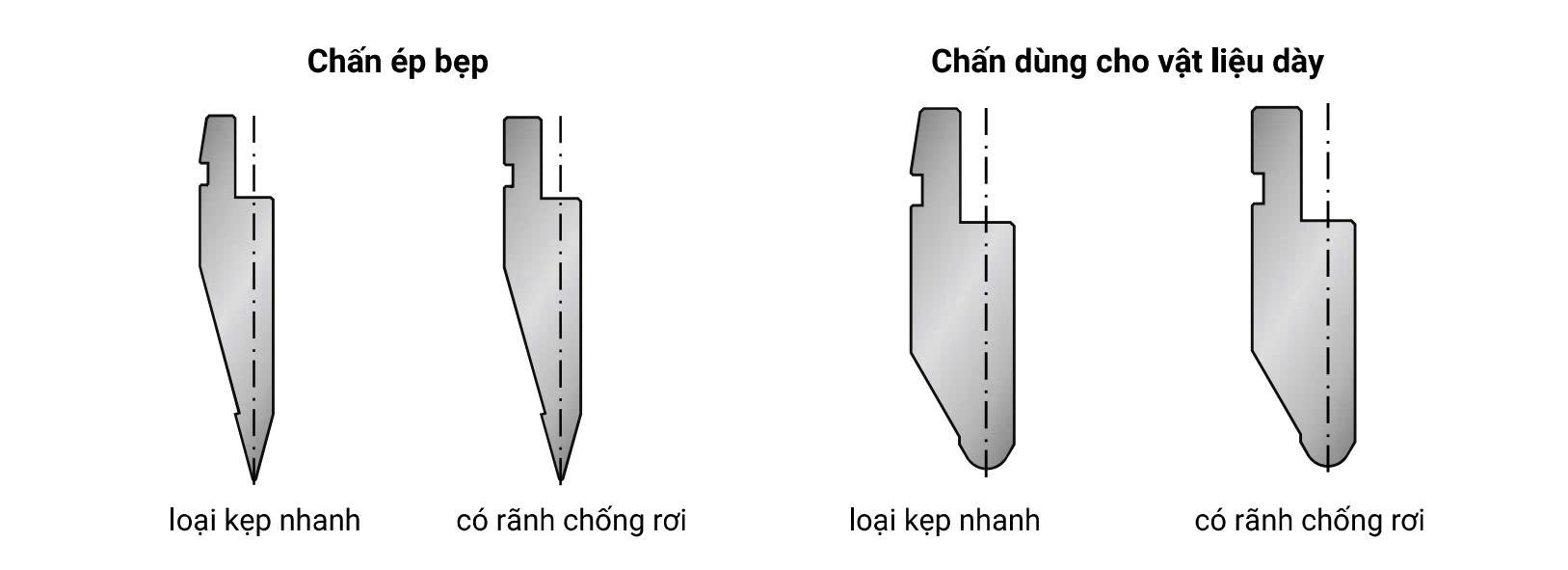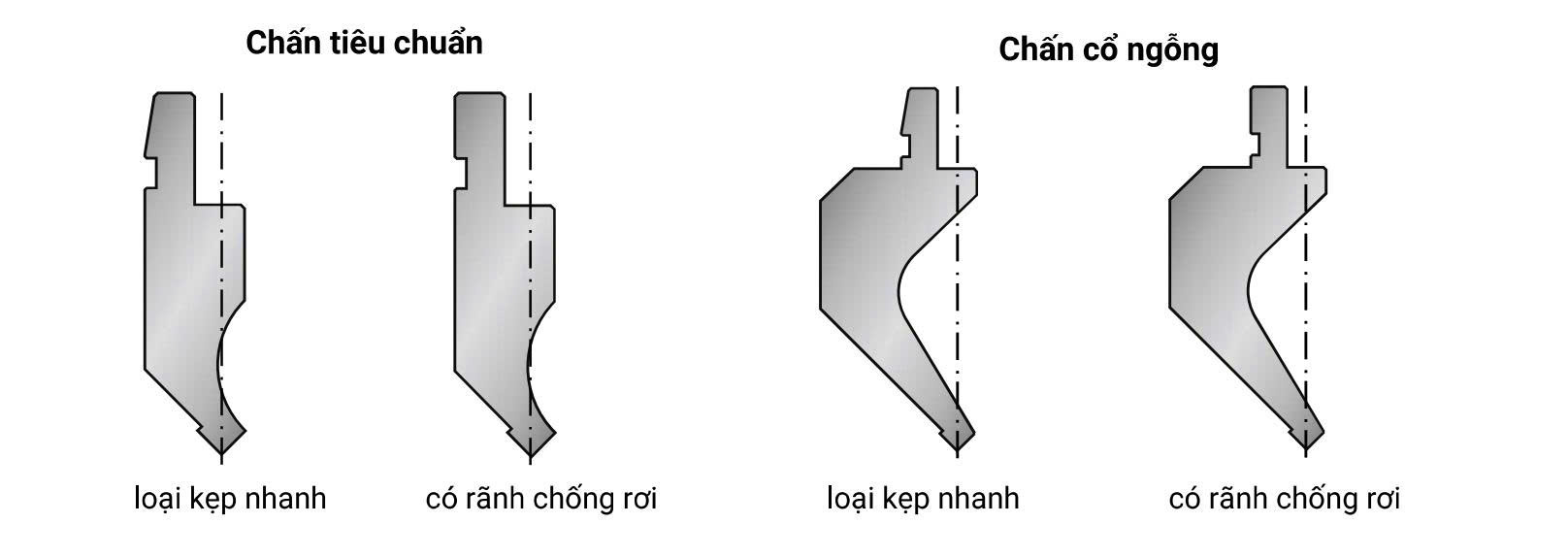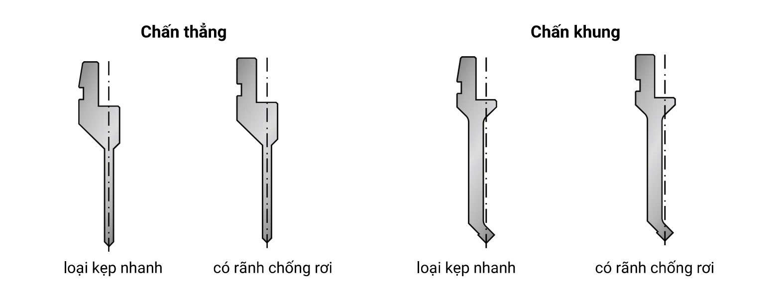 Tùy theo hình dạng chi tiết, độ sâu của góc chấn và phương pháp gia công, dao chấn được thiết kế với nhiều cấu hình khác nhau. Mỗi loại dao phù hợp với một nhóm ứng dụng riêng, giúp đảm bảo góc chấn chính xác đồng thời tránh va chạm giữa dao và chi tiết trong quá trình gia công.