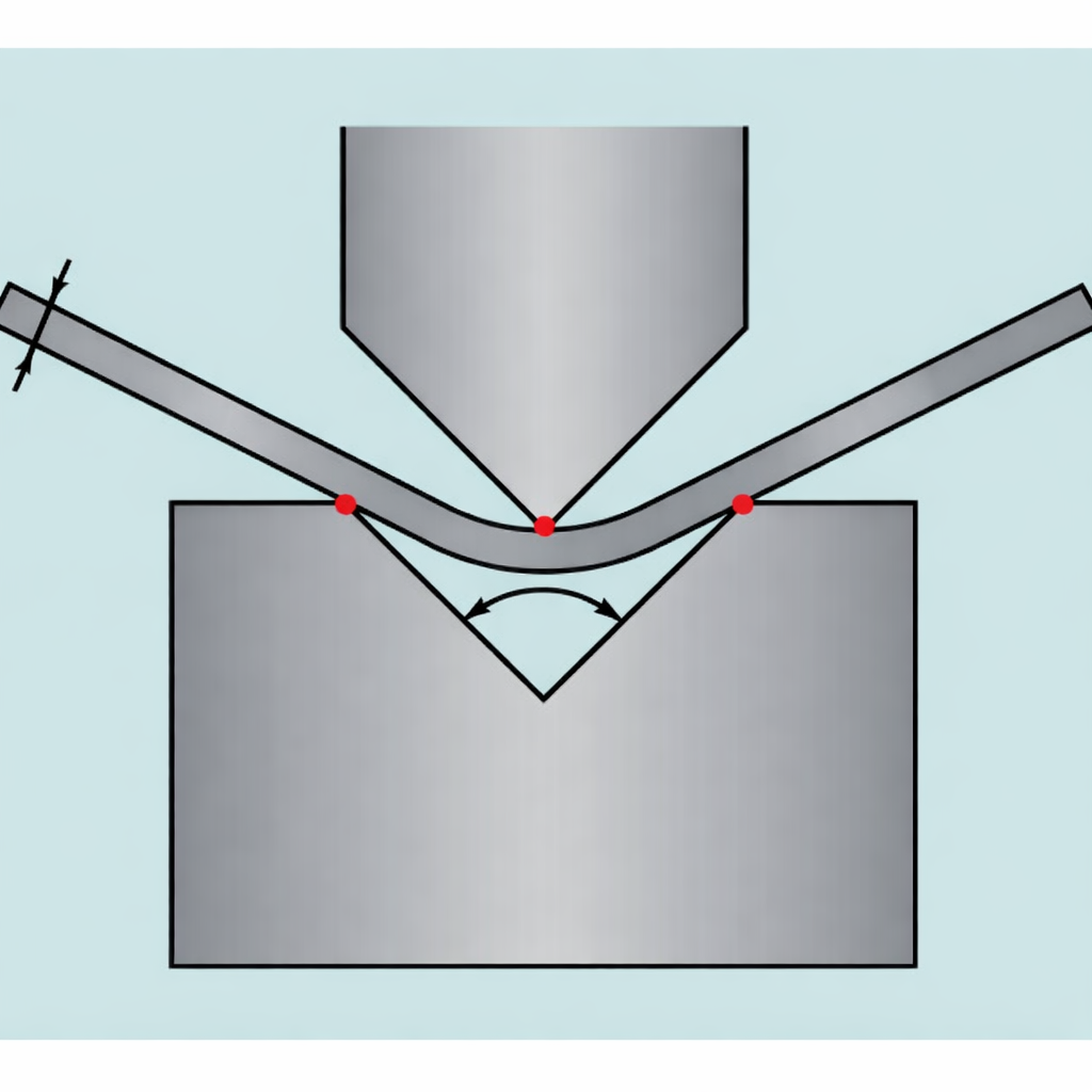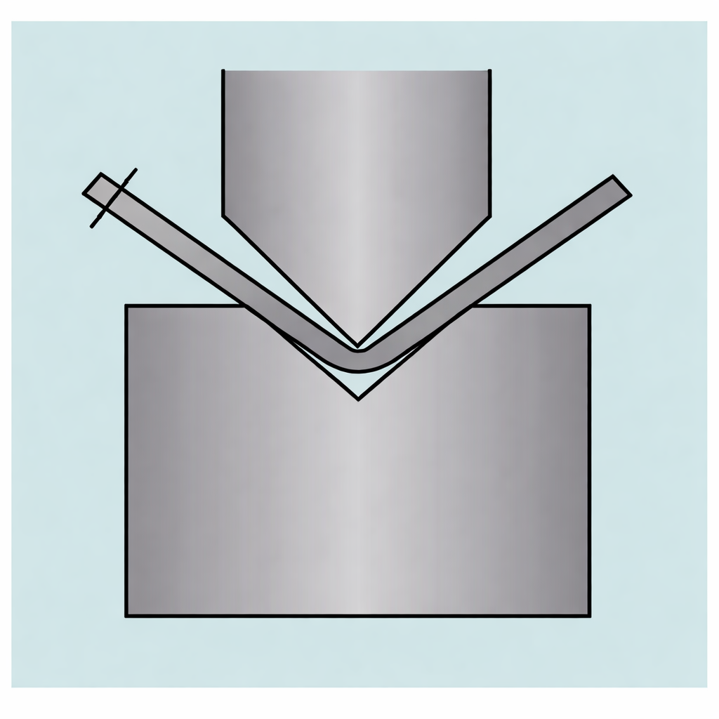 Air Bending là phương pháp chấn phổ biến nhất trong gia công kim loại tấm hiện nay. Trong phương pháp này, dao chấn ép tấm kim loại xuống rãnh V của cối chấn nhưng không ép sát hoàn toàn vật liệu vào đáy cối. Vật liệu chỉ tiếp xúc với ba điểm chính gồm mũi dao chấn và hai cạnh của rãnh V trên cối chấn. Nhờ cơ chế này, góc chấn được hình thành từ sự biến dạng dẻo của vật liệu giữa ba điểm tiếp xúc, thay vì bị ép theo hình dạng của cối. Điều này cho phép người vận hành có thể điều chỉnh góc chấn bằng cách thay đổi hành trình của dao chấn.