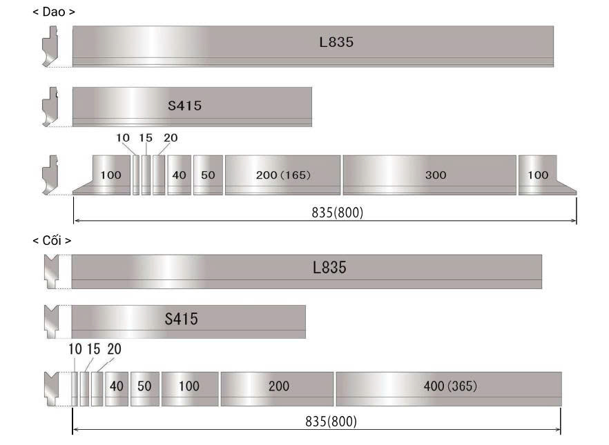- Chấn dùng cho vật liệu dày: Đối với các vật liệu có độ dày lớn, dao chấn được thiết kế với cấu trúc chắc chắn hơn để chịu được lực chấn lớn.