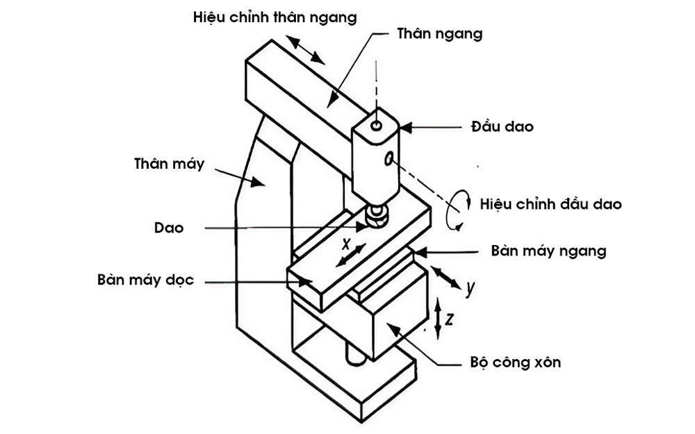- Máy phay công xôn: Bàn máy ngang được nâng đỡ bởi công xôn và có thể di chuyển theo phương đứng.