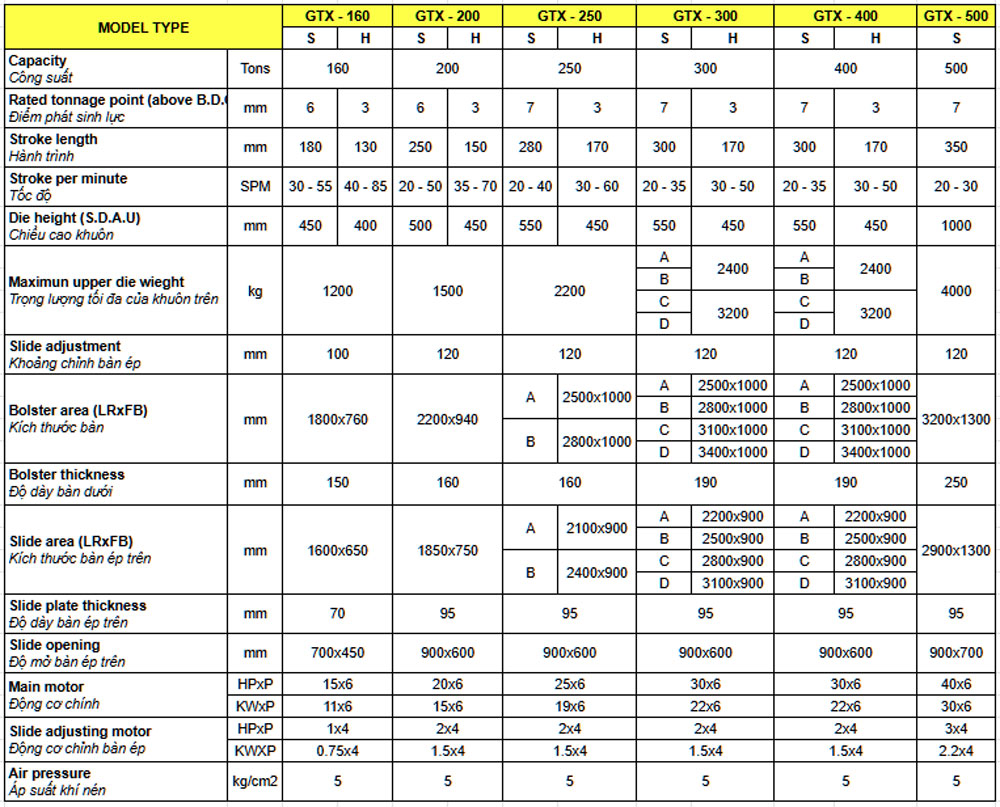 Thông số kỹ thuật máy dập khung H hai trục khuỷu – GTX series