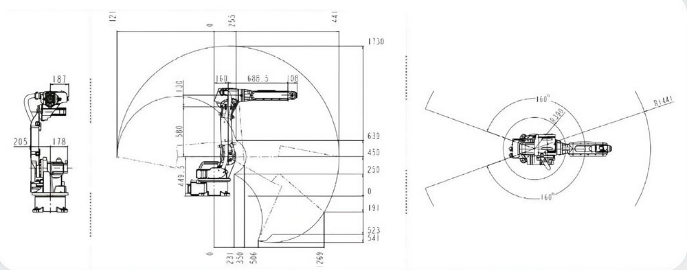 - Thiết kế nhỏ gọn – không gian làm việc lớn: Với cấu trúc 6 trục, robot gắp QJR6-1 có sải tay 1.441 mm và khả năng lặp lại định vị chính xác ±0.03 mm. Thiết kế nhỏ gọn nhưng vẫn bao quát vùng làm việc rộng, phù hợp nhiều môi trường sản xuất khác nhau.