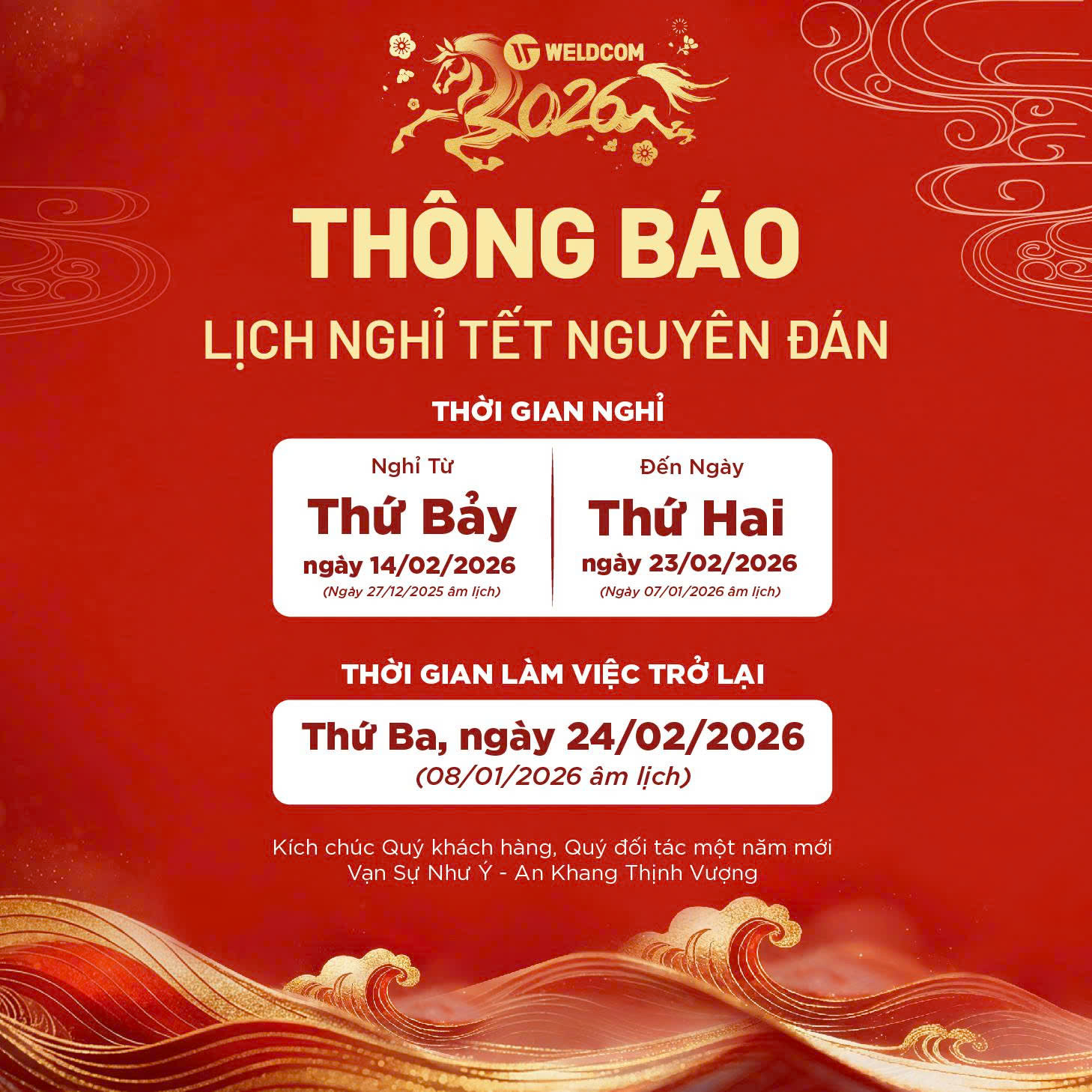 Đồng thời, Weldcom xin trân trọng thông báo lịch nghỉ Tết Nguyên Đán Bính Ngọ 2026 của công ty như sau: