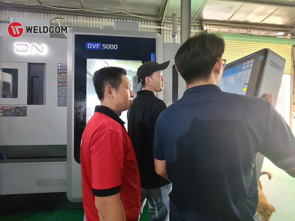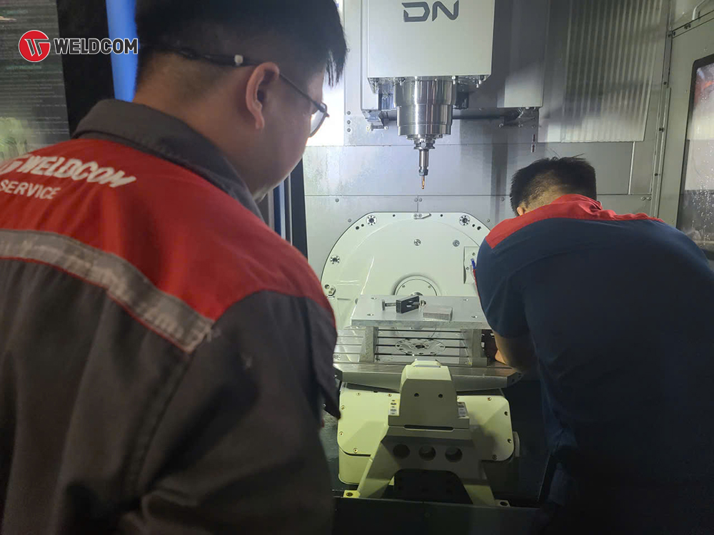 Sau khi hiệu chỉnh, kỹ sư Weldcom và chuyên gia DNS tiến hành chạy thử máy với các chương trình gia công mẫu. Quá trình này nhằm kiểm tra độ chính xác, tốc độ, độ lặp lại và độ ổn định trong sản xuất thực tế. Tiếp đó, đội ngũ kỹ thuật trực tiếp hướng dẫn nhân viên khách hàng cách vận hành, cài đặt chương trình, thay dao, kiểm tra phôi… để có thể làm chủ hoàn toàn thiết bị.